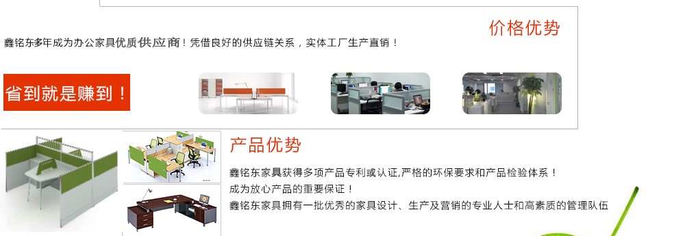 深圳市鑫銘東家具有限公司深圳市鑫銘東家具有限公司專業(yè)銷售各類辦公家具!產(chǎn)品涉及多種系列,如:班臺(tái)、班椅、屏風(fēng)、會(huì)議桌、會(huì)議椅、辦公沙發(fā)、茶幾、辦公桌、文件柜、電腦桌椅、各式餐臺(tái)、餐椅、書柜等辦公家具。 鑫銘東家具擁有一批優(yōu)秀的家具設(shè)計(jì)、生產(chǎn)及營銷的專業(yè)人士和高素質(zhì)的管理隊(duì)伍。銘東家具以"先難后易"之戰(zhàn)略,在產(chǎn)品結(jié)構(gòu)、產(chǎn)品質(zhì)量及服務(wù)水平方面,均推陳出新,力求完善,精益求精。使我們的產(chǎn)品質(zhì)量保持在國內(nèi)外家具潮流的先進(jìn)水平,力求滿足客戶的特殊需求。鑫銘東家具多年來致力于環(huán)保、實(shí)用家具的設(shè)計(jì)與開發(fā),集生產(chǎn)、銷售、服務(wù)于一體。本著"以人為本"的設(shè)計(jì)理念,大量開發(fā)符合人體工程學(xué)的各種產(chǎn)品,以"誠信為本"的質(zhì)量方針,真材實(shí)料,認(rèn)認(rèn)真真做產(chǎn)品,實(shí)實(shí)在在做人。鑫銘東家具更致力于創(chuàng)造"零維修率"的制造境界,實(shí)現(xiàn)"沒有維修的服務(wù)才是最好服務(wù)"的口號(hào)》了解更多 |